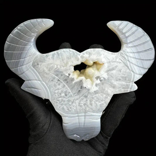 Etheric Aura White Agate Crystal Cave Carved Bull Head