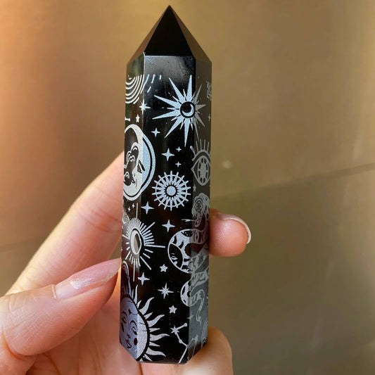 Etheric Aura Black Obsidian Crystal Tower Printed Sun and Moon Pattern